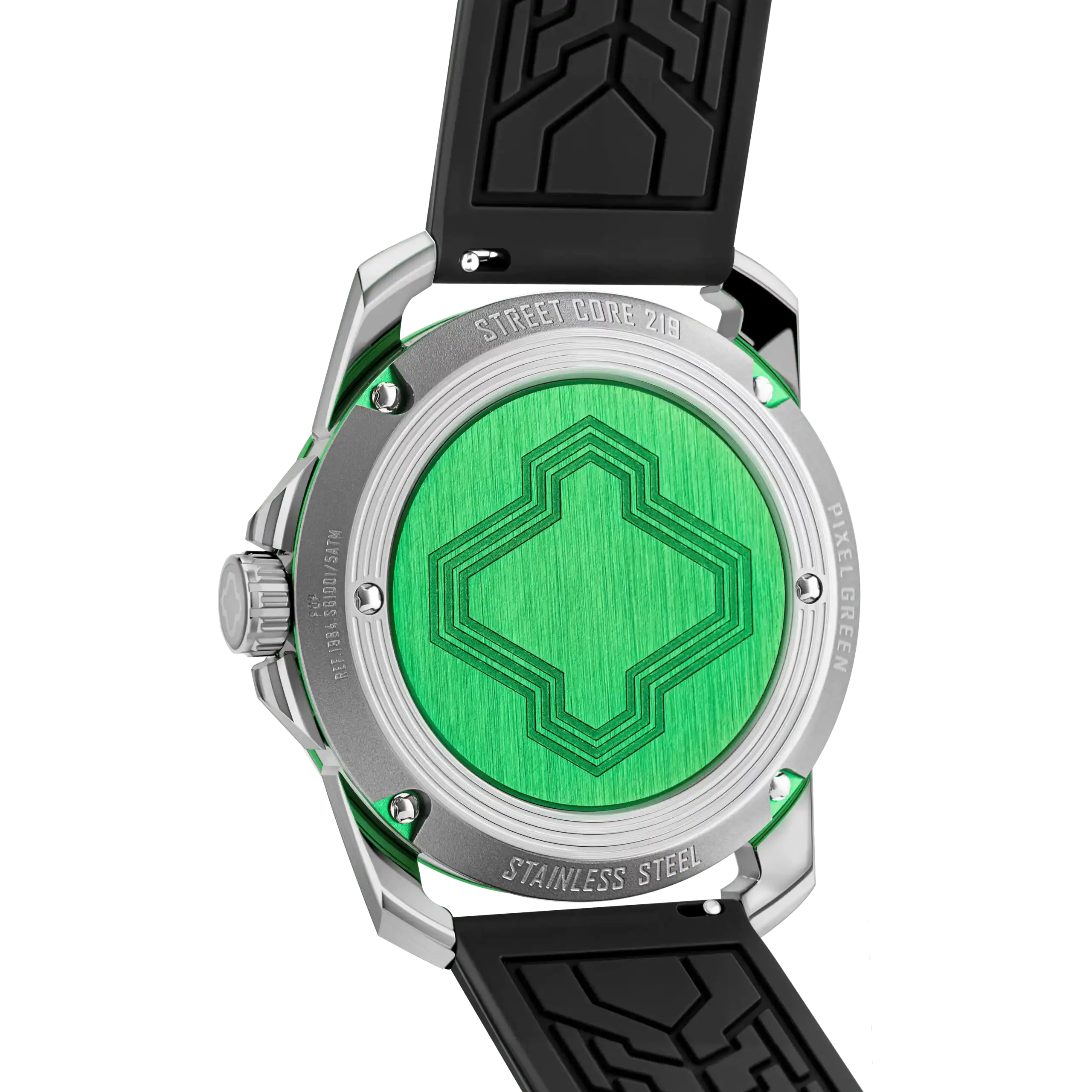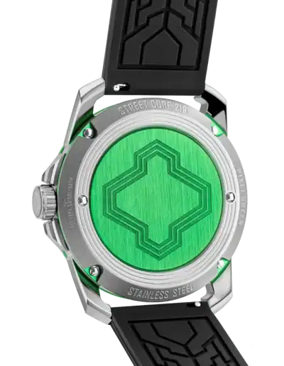 The multi-layered case, crafted from passivated 316L Stainless Steel and neon green anodized Aluminium for the spacer rings. The screwed-down case back and bezel, featuring satin, sandblasted, and polished finishes, contribute to the watch’s bold and dynamic character. On the 9 o’clock side, a laser engraving proudly displays the brand’s credo: “Street Create Legends”. The screw-down crown, ensuring 3 ATM water resistance, is knurled for perfect handling, finely engraved with a polished logo on a sandblasted background.