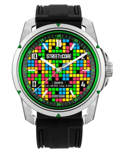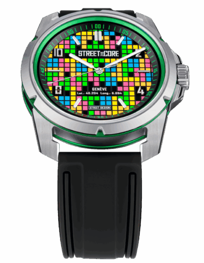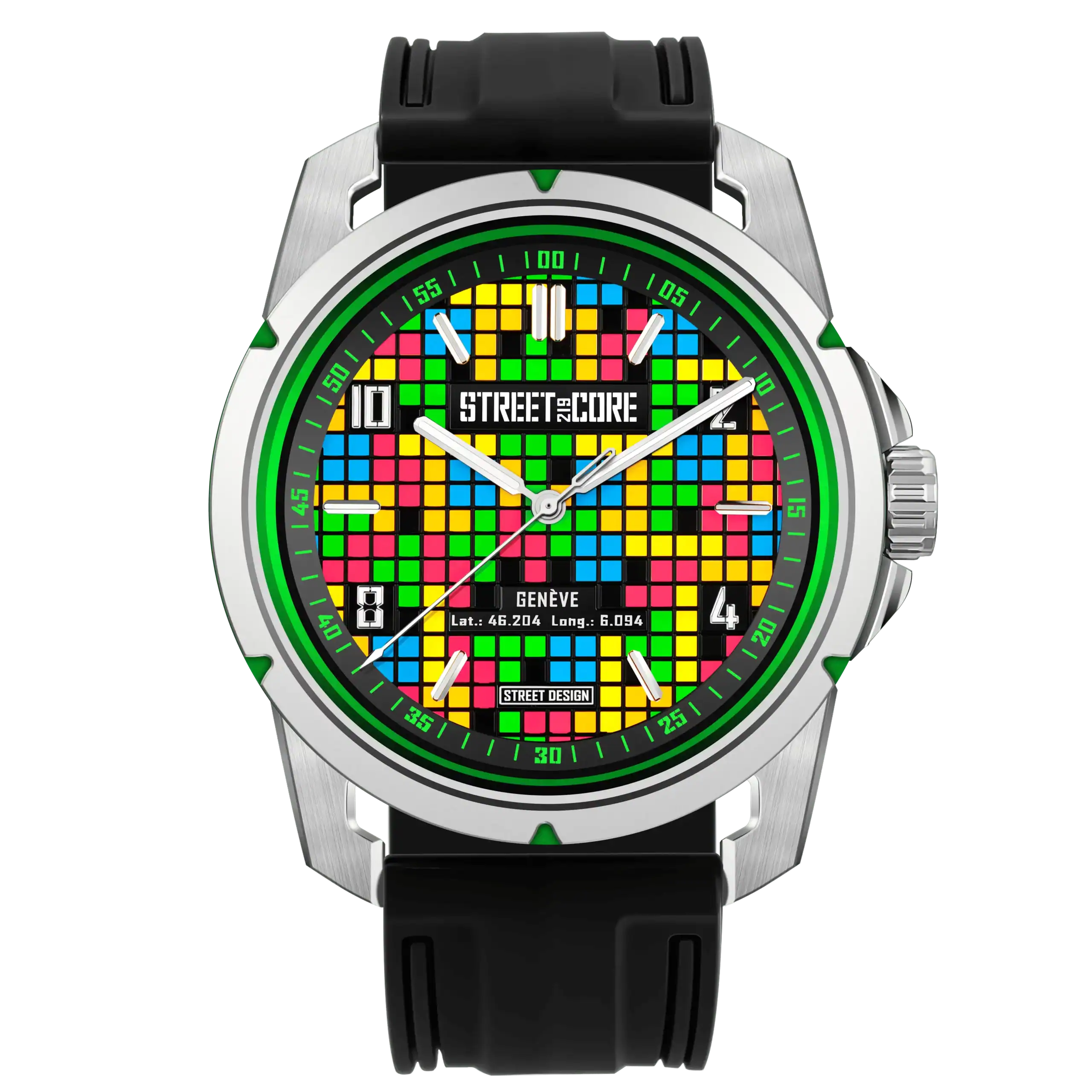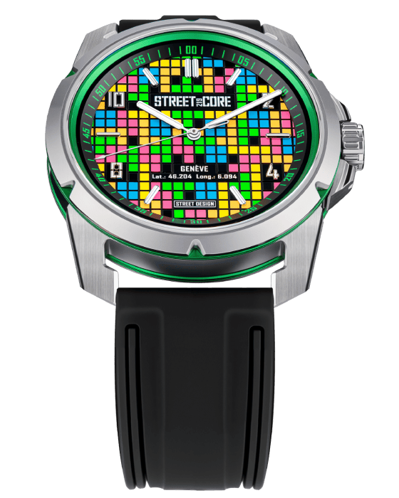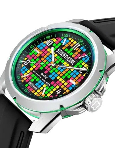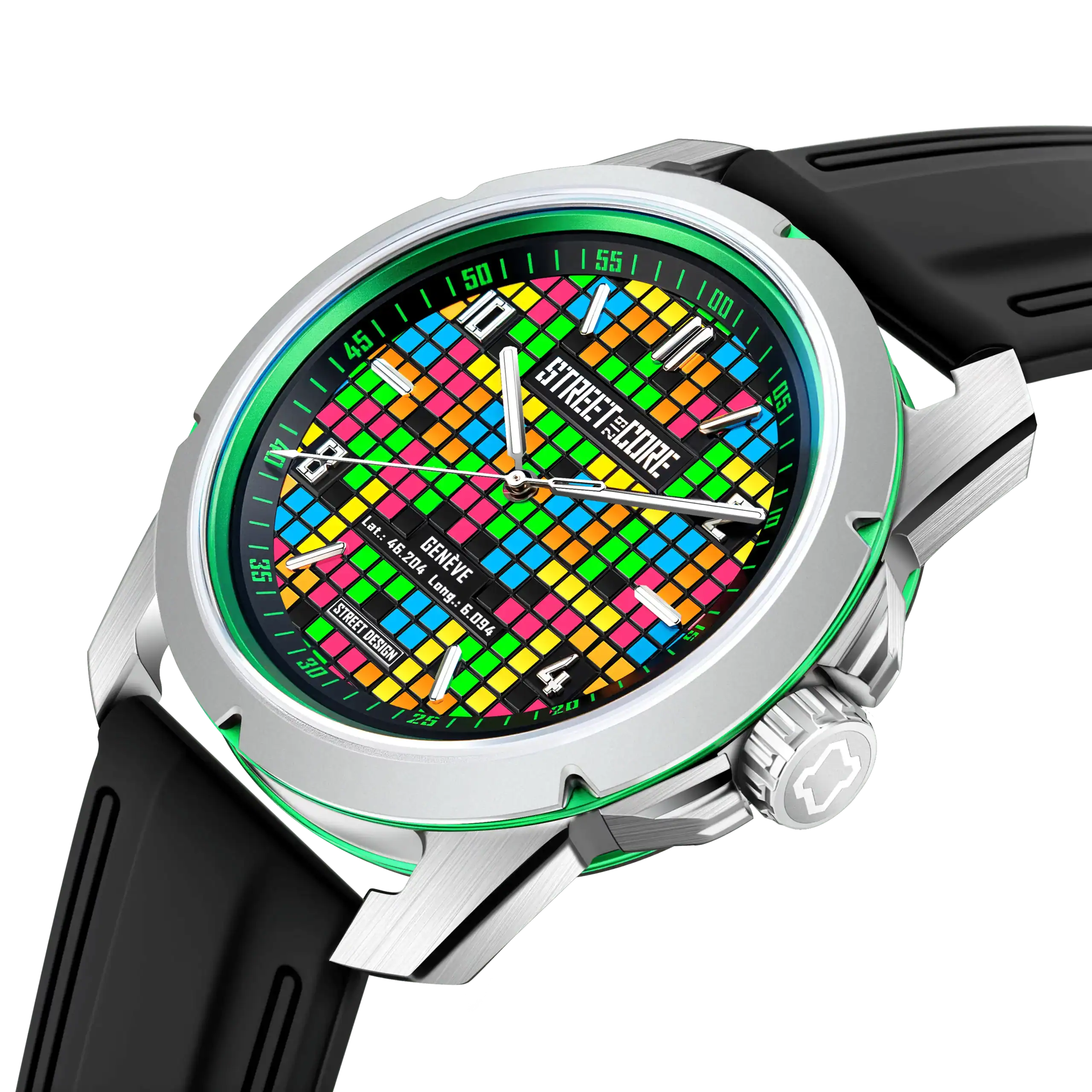 This three-hand watch features a finely detailed multicolored dial, forming a chaotic yet structured mosaic of vivid pixels, reminiscent of 1980s arcade games. For enhanced depth and readability, the matte black inclined rehaut, adorned with a neon green decal, pairs with 12 metallic gray hour markers coated with pure white SLN.