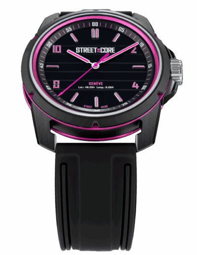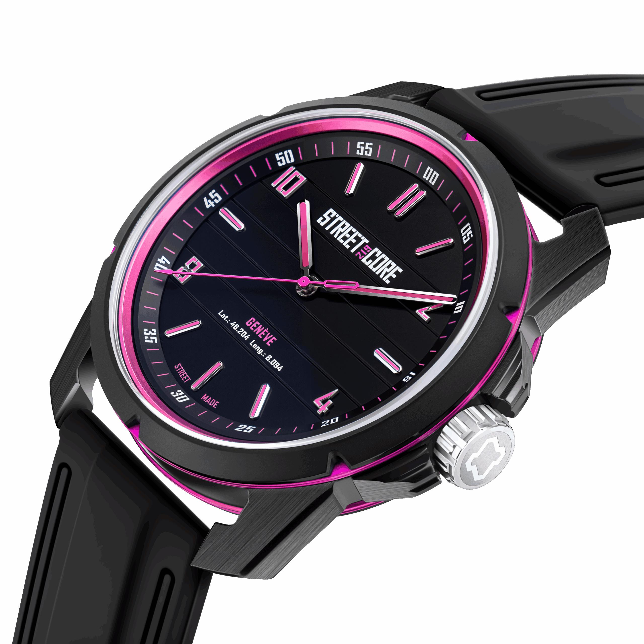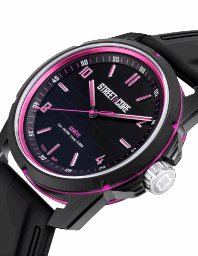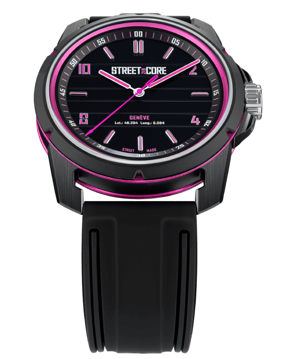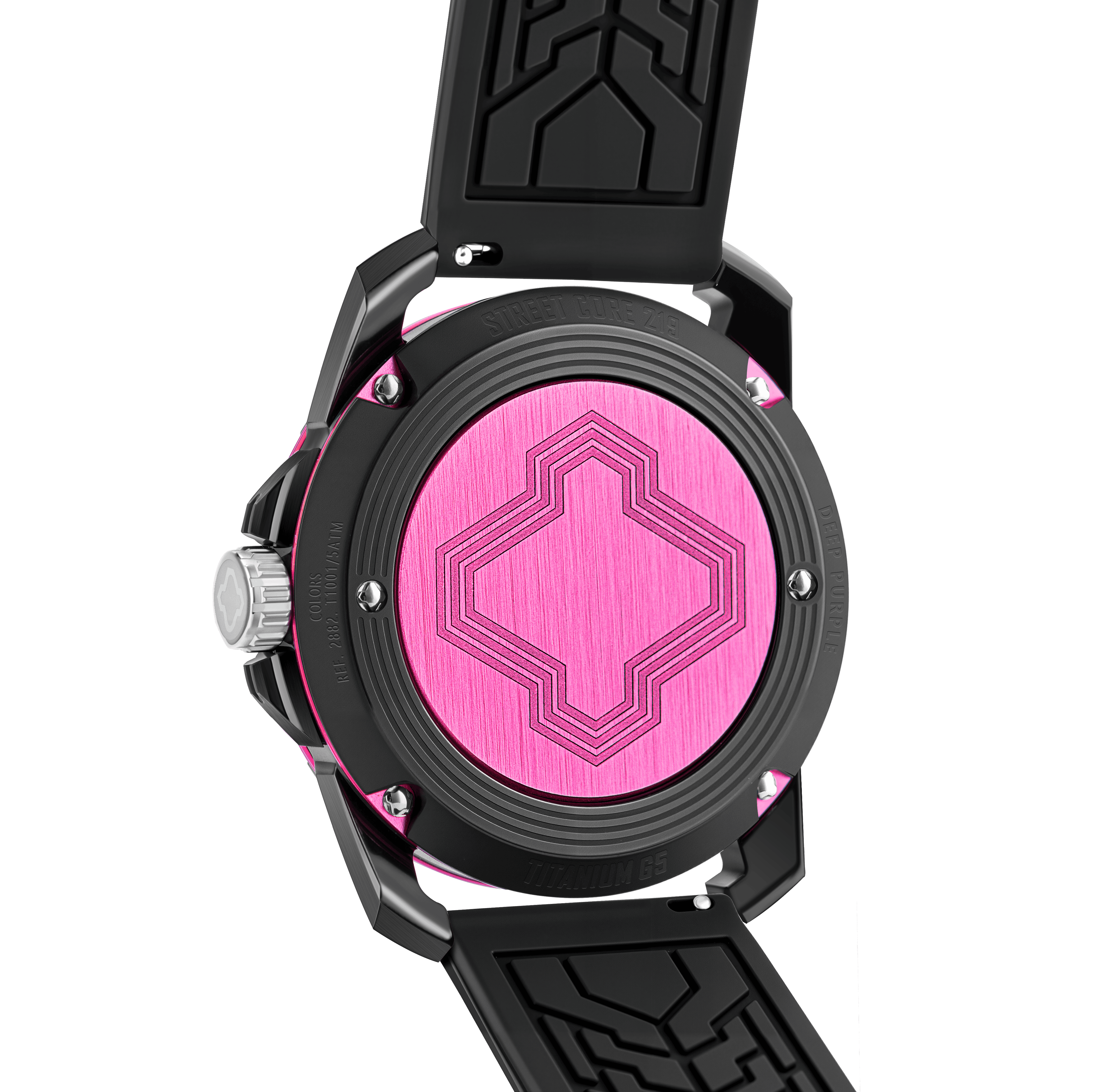 The multi-layered case, engineered from Grade 5 titanium with black DLC coating and vivid purple anodization for the two aluminium spacer rings. The screwed-down case back and bezel, featuring satin, sandblasted, and polished finishes, ensure a 70’s power rock and mysterious psychedelic experience aesthetics. The 9 o’clock punch-marked side proudly displays the brand’s slogan: « Street Create Legends ». The screw-down crown, ensuring 5 ATM water resistance, features a knurled grip for enhanced handling, finely engraved with a polished logo on a sandblasted background.