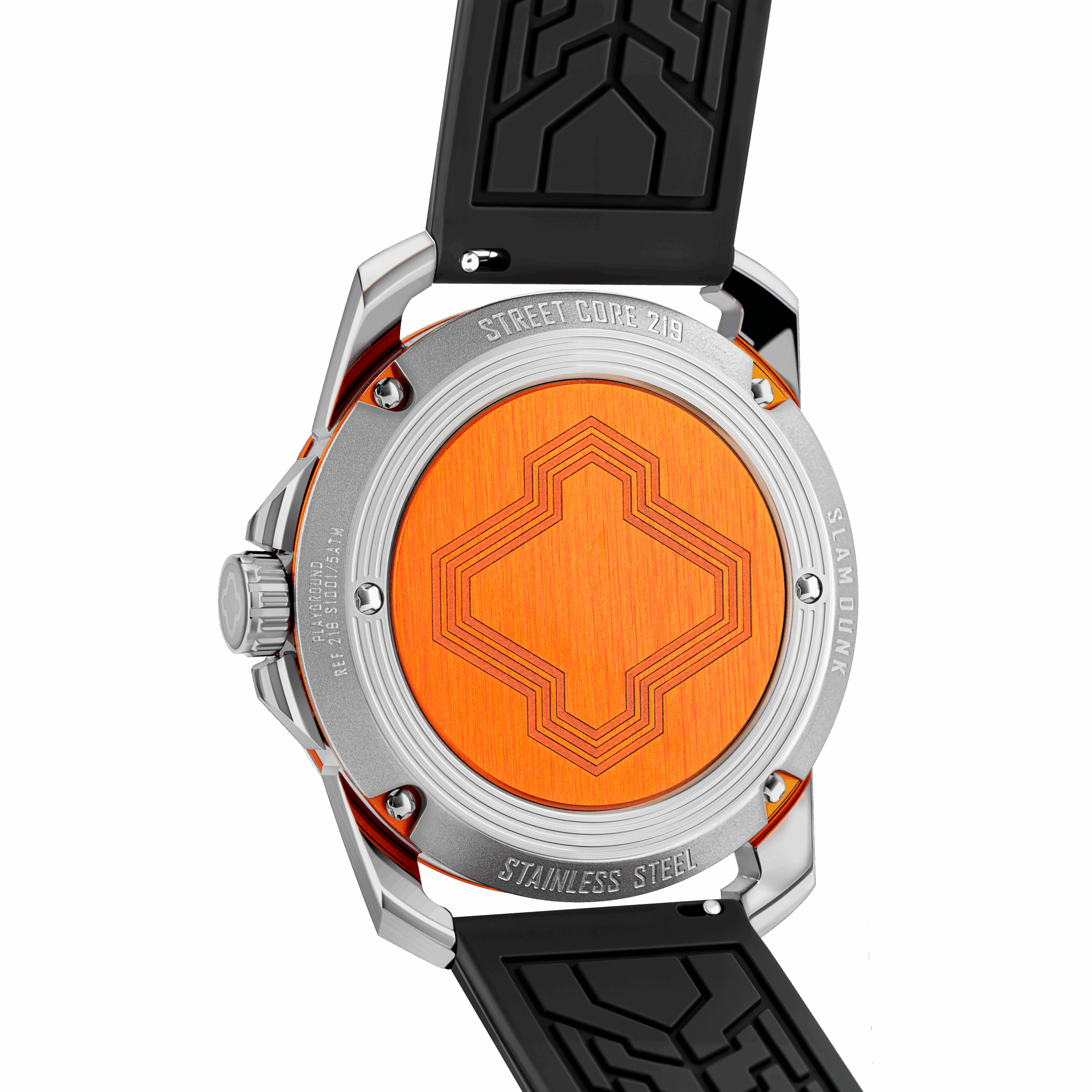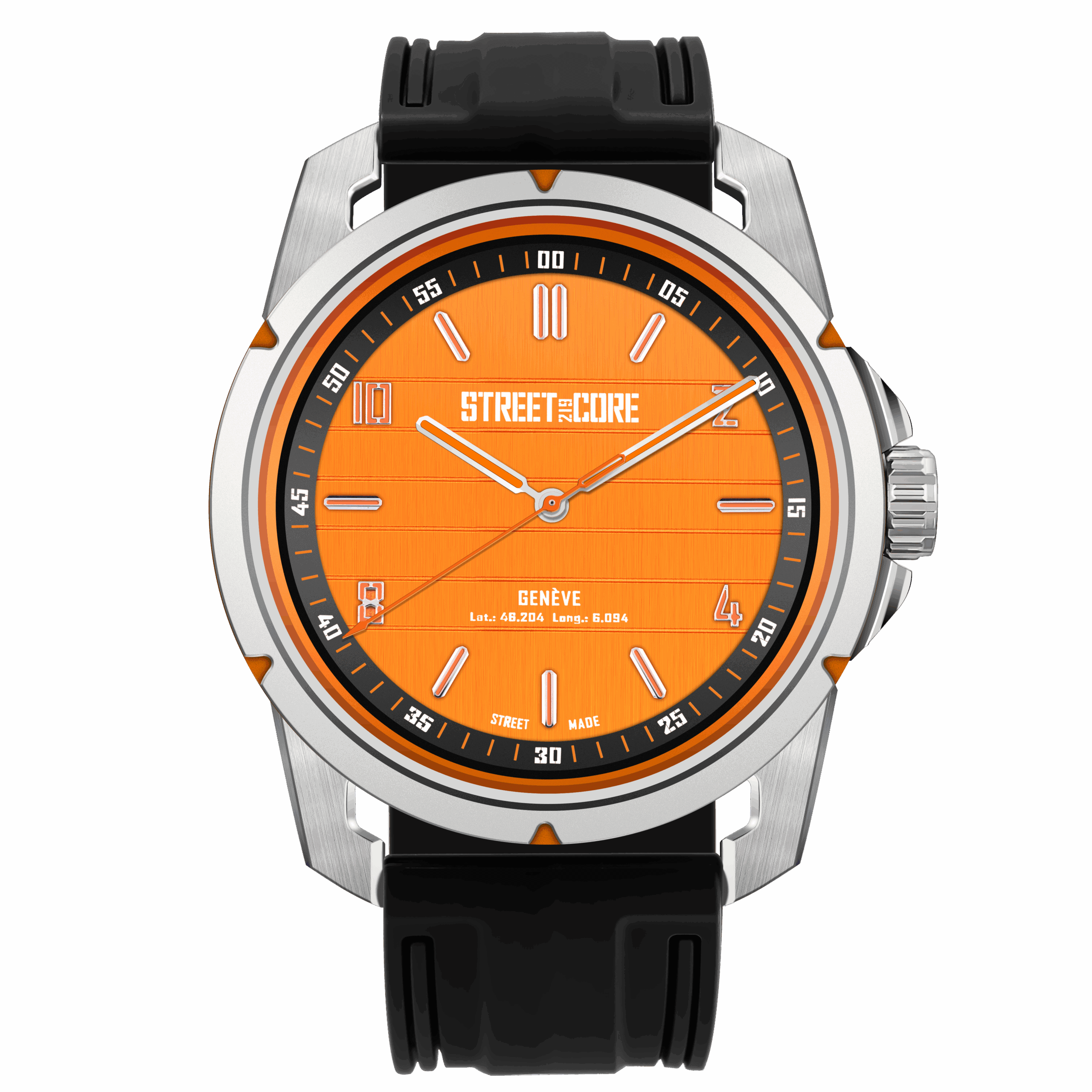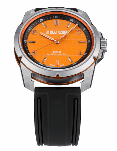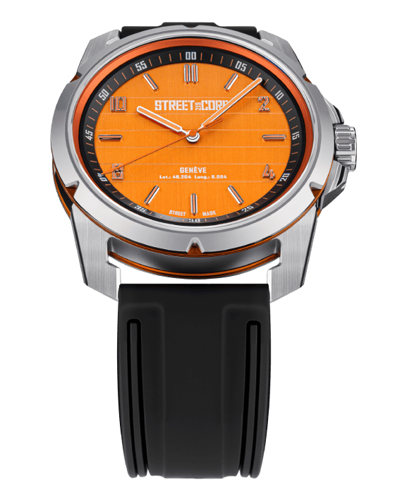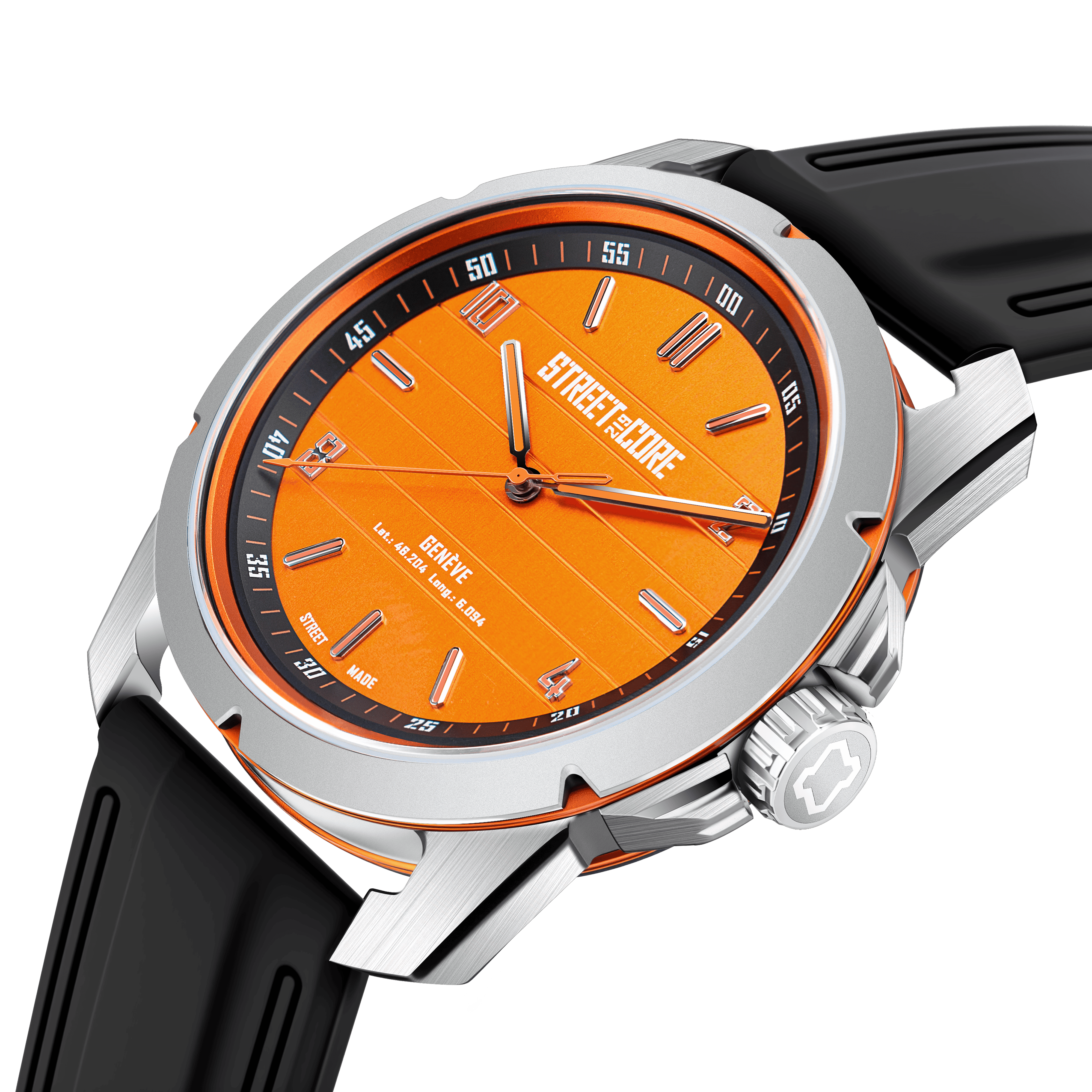 The multi-layered case, crafted from passivated 316L stainless steel and bright orange anodized Aluminium for the spacer rings. The screwed-down case back and bezel, finished with satin, sandblasted, and polished textures, reinforce the watch’s sporty and bold identity. On the 9 o’clock side, a laser engraving proudly displays the brand’s credo: “Street Create Legends”. The screw-down crown, ensuring 3 ATM water resistance, provides a knurled grip for superior handling, finely engraved with a polished logo on a sandblasted background.