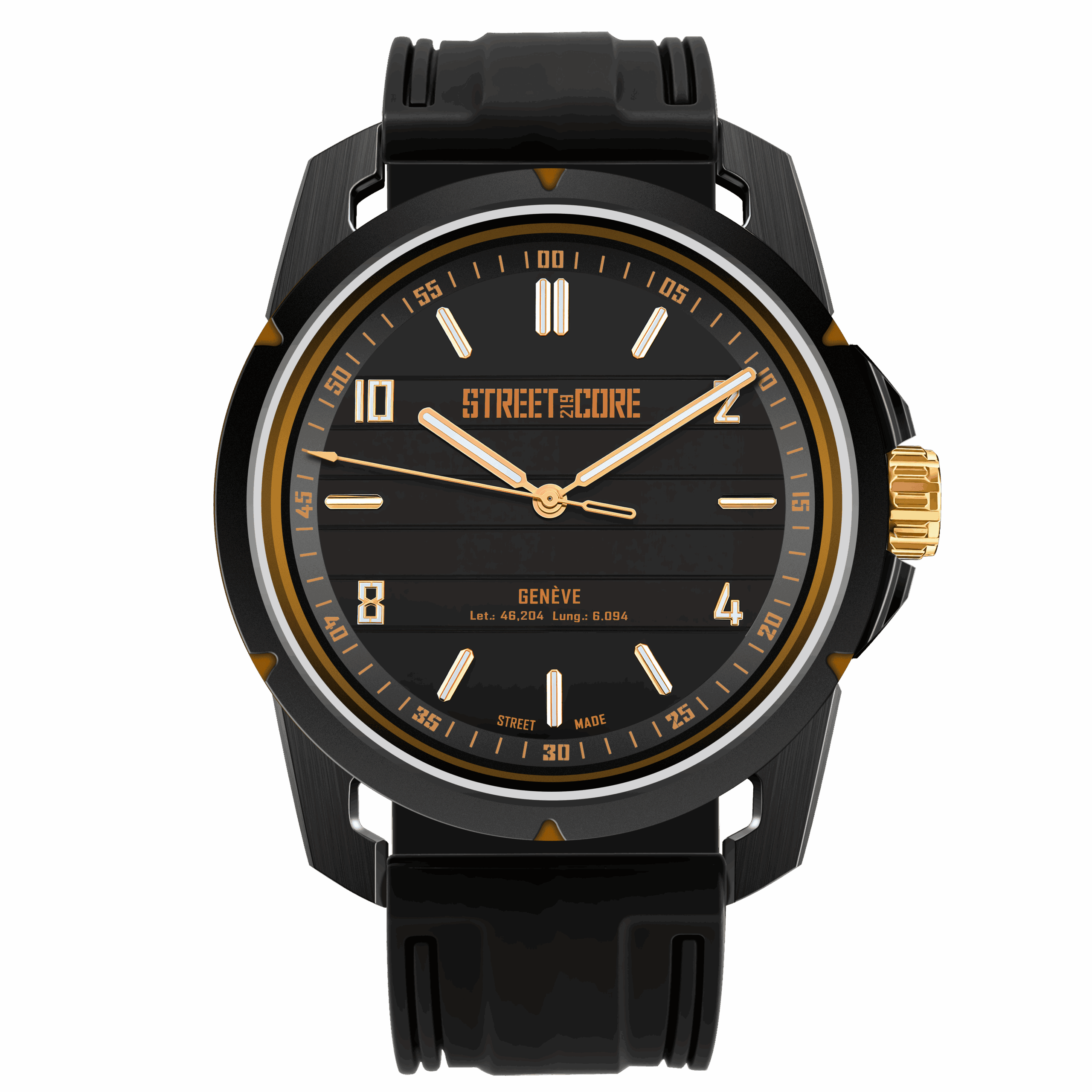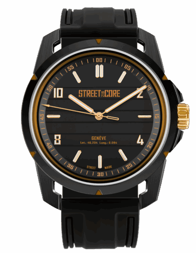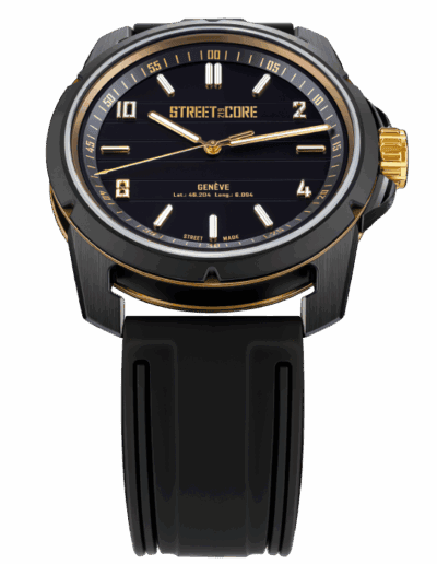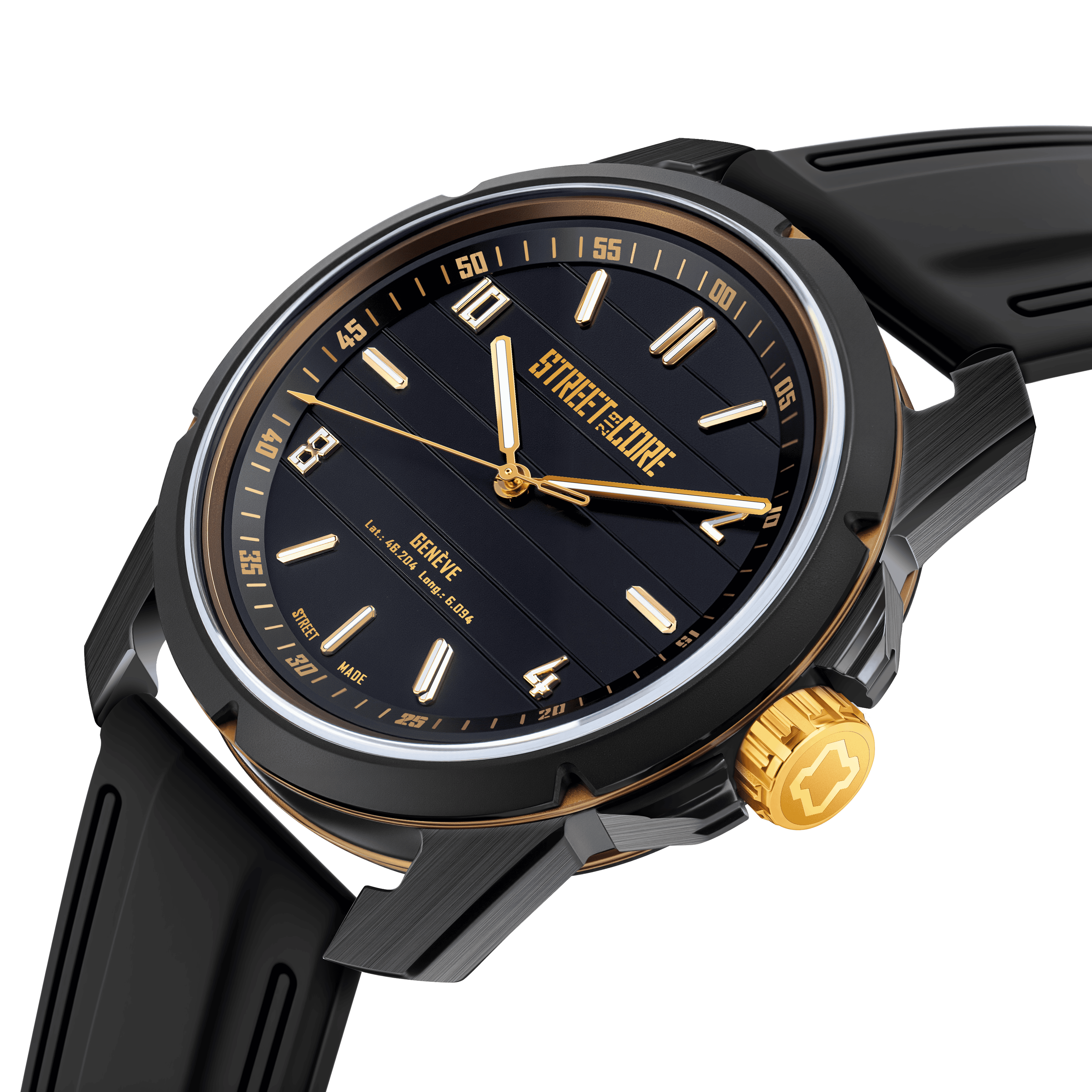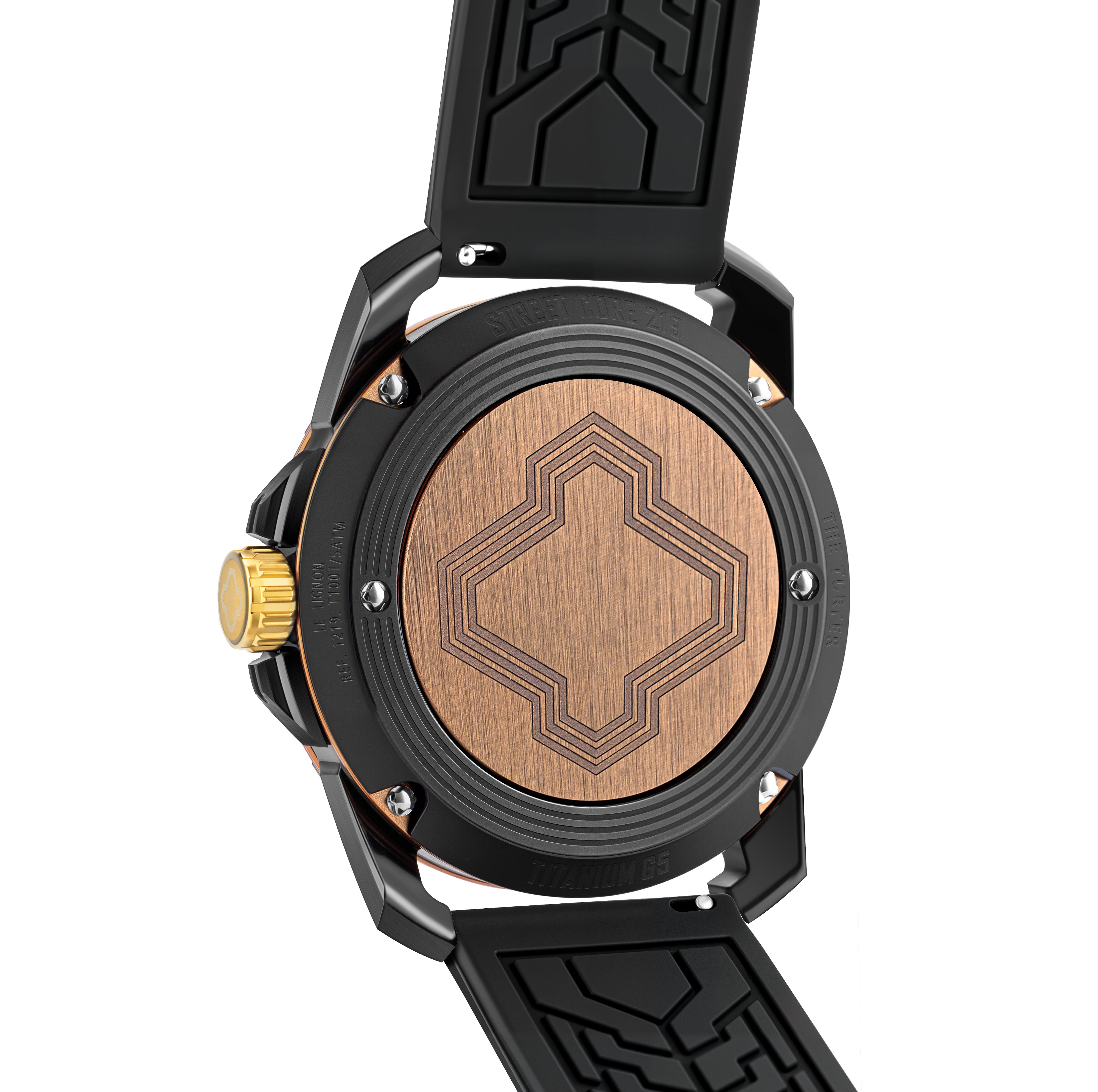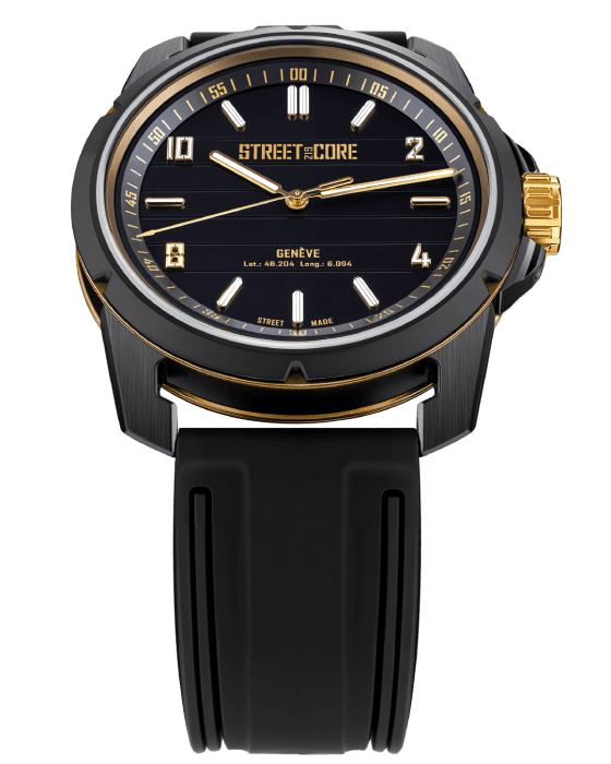 The multi-layered case, crafted from Black DLC (Diamond Like Carbon) coated Steel and 4N gold plating for the two Aluminium spacer rings. On the 9 o’clock side, a laser engraving proudly displays the brand’s credo: “Street Create Legends”. The screwed-down case back and bezel, featuring satin, sandblasted, and polished textures, offer a bold yet refined aesthetic. The screw-down crown, ensuring 3 ATM water resistance, features a knurled grip for perfect handling, finely engraved with a polished logo on a sandblasted background.