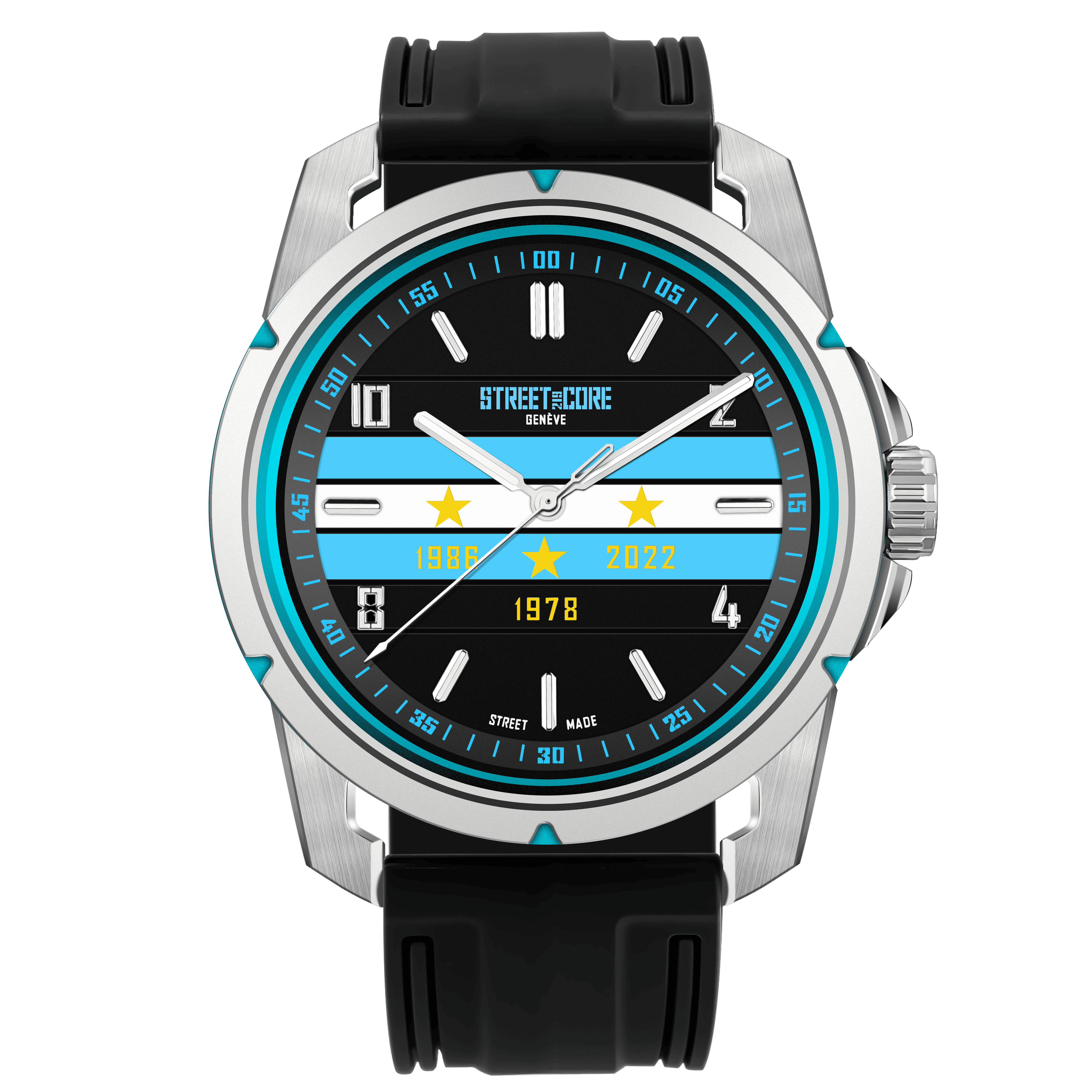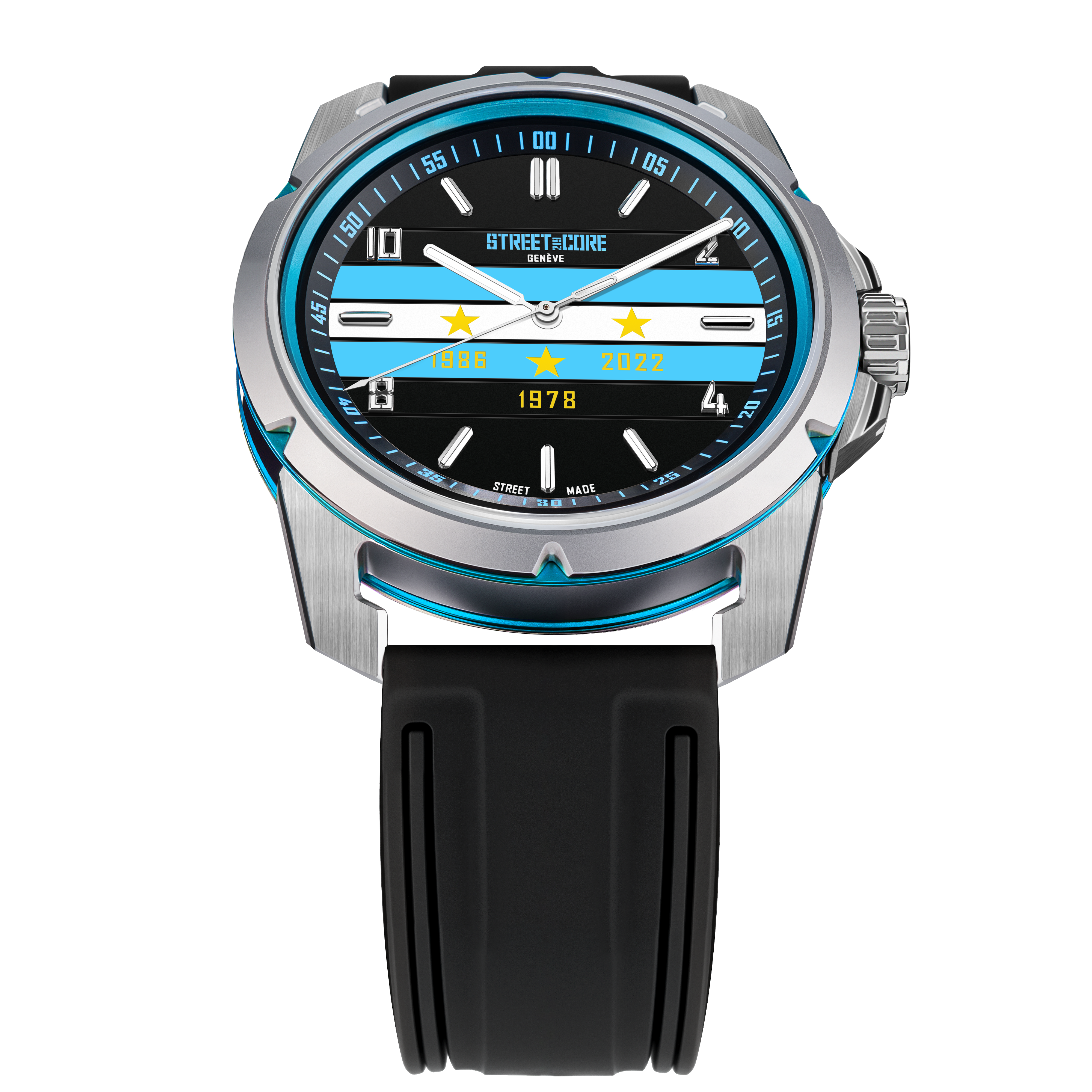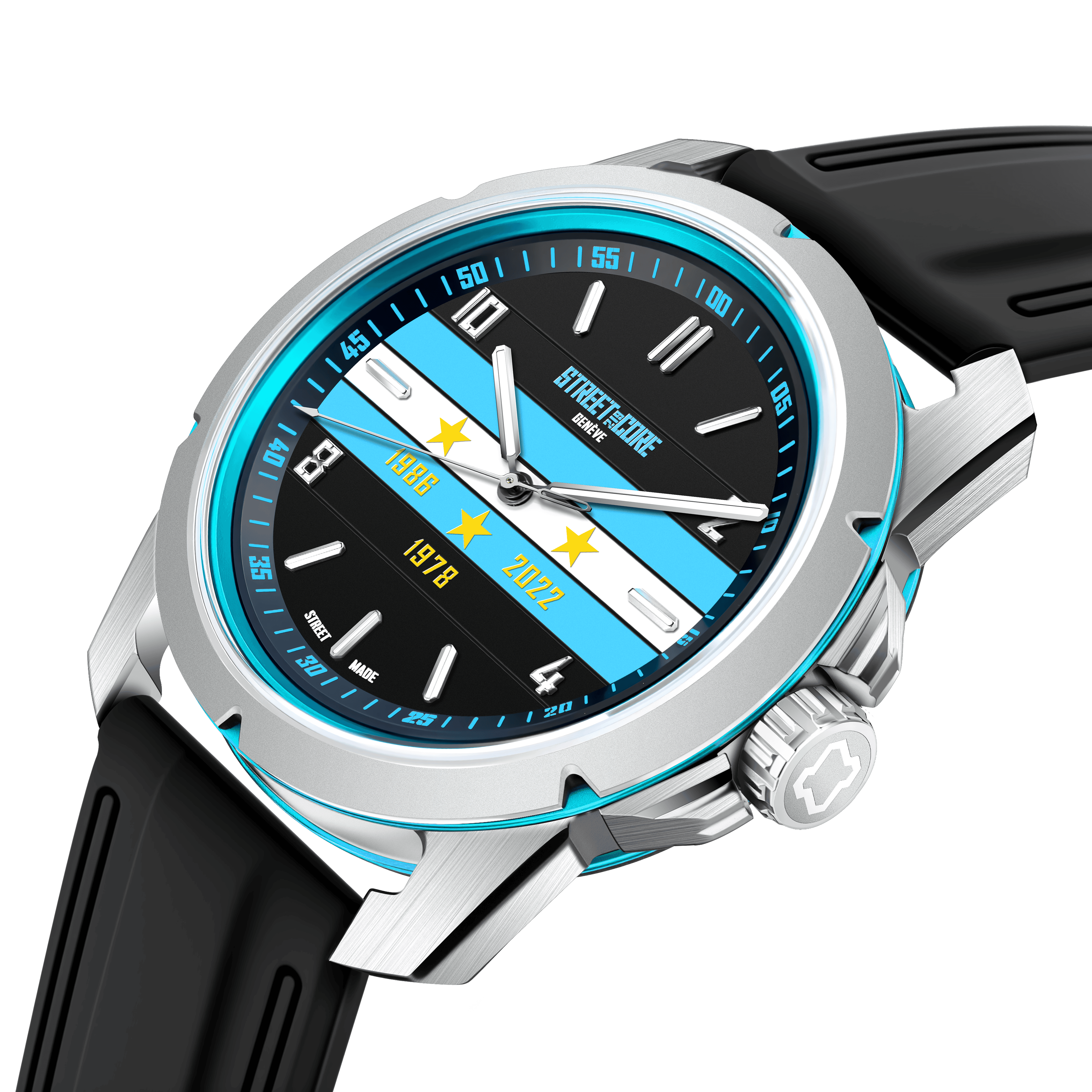 This three-hand watch features a vertically finished deep matte black dial, complemented by six horizontal ribs, reflecting the Earthās latitudes. The three central ribs, painted in Sky Blue and Glacier White, are adorned with three stars representing Argentinaās World Cup victories in 1978, 1986, and 2022. To enhance depth and readability, the matte black inclined rehaut, decorated with a light blue decal, pairs with 12 metallic gray hour markers coated with sky blue and pure white SLN.