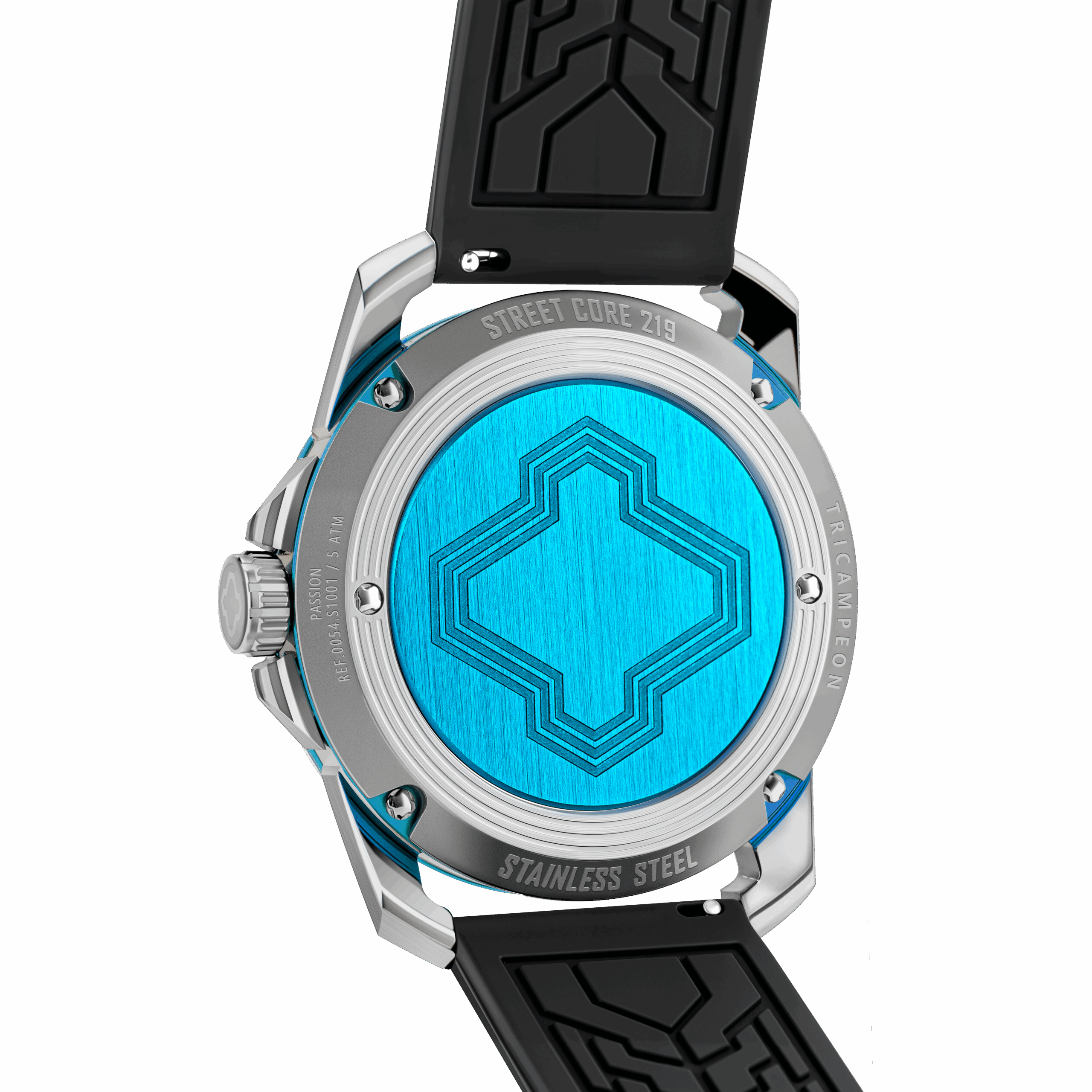The multi-layered case, made from passivated 316L Stainless Steel and sky blue anodized Aluminium for the two spacer rings. The screwed-down case back and bezel, with satin, sandblasted, and polished finishes, offer a sporty and rugged look. On the 9 oāclock side, a laser engraving proudly displays the brandās credo: āStreet Create Legendsā. Ā The screw-down crown, ensuring 3 ATM water resistance, features a knurled grip for enhanced handling, finely engraved with a polished logo on a sandblasted background.